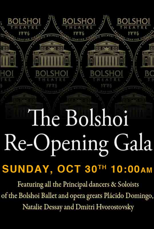 An event seven years in the making: The Bolshoi celebrates the re-opening of its historic main theatre. The Bolshoi Re-Opening Gala LIVE features excerpts from Russian masterpieces such as Don Quixote, The Flames of Paris, The Bright Stream, Spartacus, Swan Lake and more, performed by all the Principal dancers and Soloists of the Bolshoi, along with operatic performances by Placido Domingo, Natalie Dessay, Dmitri Hvorostovsky, Violeta Urmana and other special guests. Laemmle Theatres will be screening the recording of this Friday, October 28 Moscow performance.