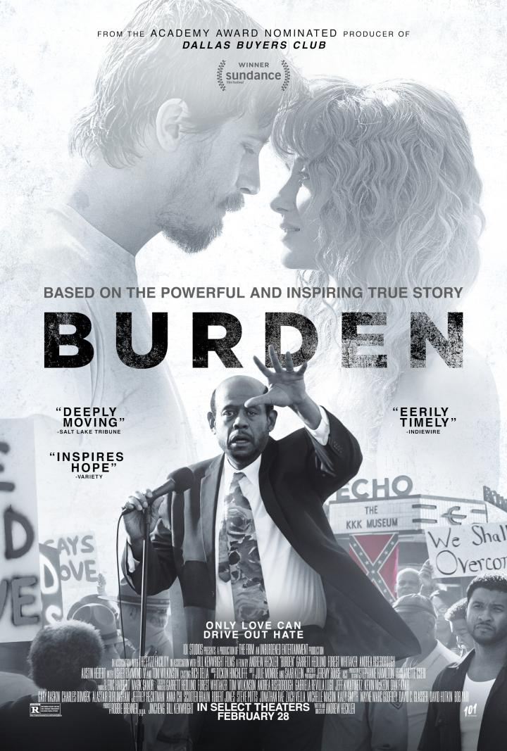 Academy Award winner Forest Whitaker (The Butler, Black Panther) and Garrett Hedlund (Mudbound) star in a powerful and timely true story of faith and love overcoming hate. Set in a small South Carolina town scarred by deep-rooted racism in the mid-nineties, an unlikely friendship forms when an African American Reverend (Whitaker) shelters Mike Burden (Hedlund) a KKK member, along with his girlfriend Judy, a single mother played by Andrea Riseborough. Through his faith and love, Reverend Kennedy helps Mike leave his violent past in the Klan ultimately helping to heal the community. From Oscar®-nominated filmmaker Robbie Brenner (Dallas Buyers Club) and writer-director Andrew Heckler, BURDEN features incredible performances by Whitaker, Hedlund, Riseborough, Tom Wilkinson, Tess Harper, Crystal Fox and Usher Raymond.