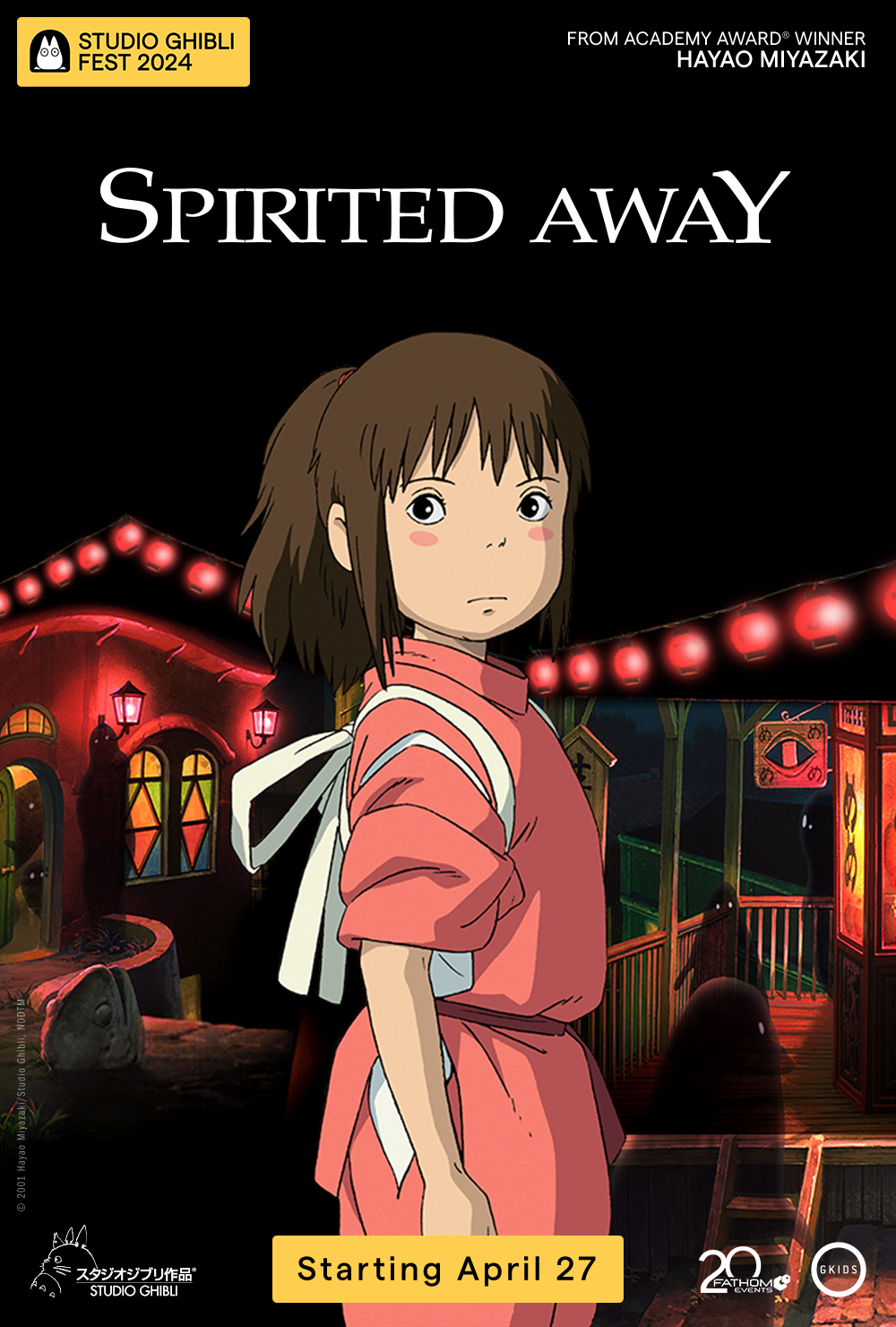 Chihiro’s family is moving to a new house, but when they stop on the way to explore an abandoned village, her parents undergo a mysterious transformation and Chihiro is whisked into a world of fantastic spirits ruled over by the sorceress Yubaba. Put to work in a magical bathhouse for spirits and demons, Chihiro must use all her wits to survive in this strange new place, find a way to free her parents and return to the normal world. Overflowing with imaginative creatures and thrilling storytelling, Spirited Away became a worldwide smash hit, and is one of the most critically acclaimed films of all time.