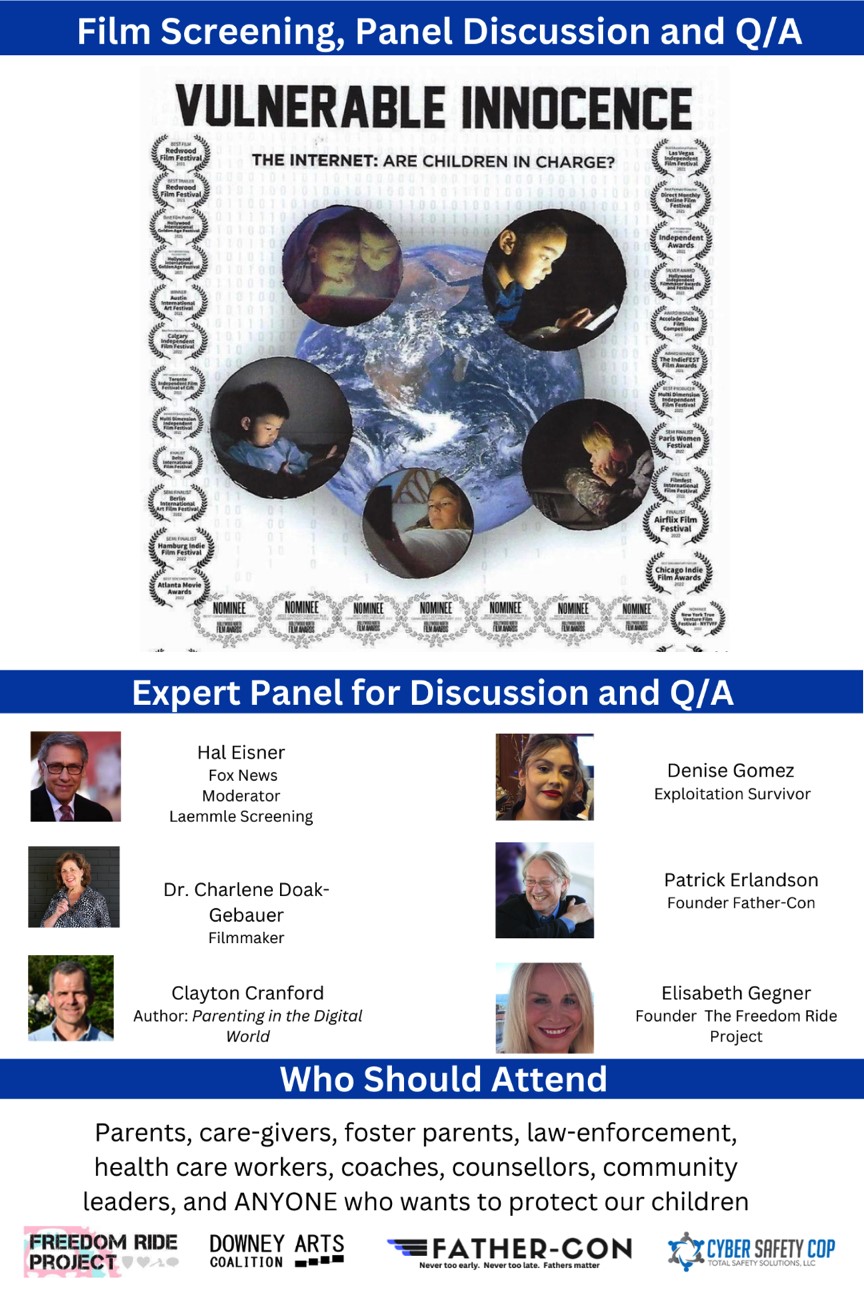 Vulnerable Innocence, winner of 24 international documentary film awards, exposes the tactics of predators and provides practical solutions for anyone who wants to protect children online. Screening will be followed by a dynamic discussion with esteemed Fox 11 News journalist Hal Eisner, Filmmaker, Dr. Charlene Doek-Gebauer, Survivor, Denise Gomez, and other international experts from law enforcement, education and non-profits involved in the fight against online exploitation.
